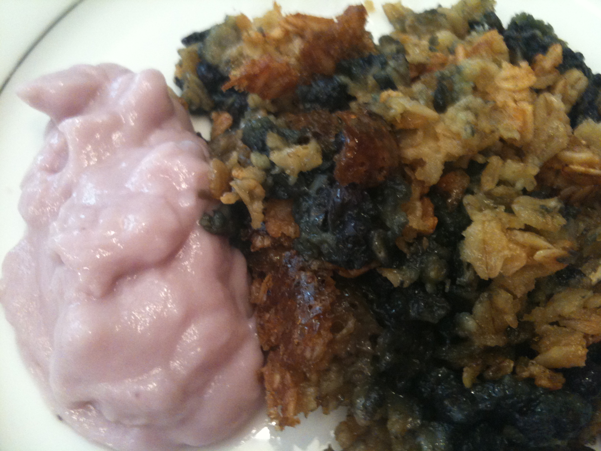 I replaced the 1/2 cup of honey with 1/4 cup of agave nectar, and I definitely think it came out sweet enough. Like Becky, I replaced butter with Earth Balance, my new favorite ingredient! Finally, to add some fun color and flavor, I put some Amande blueberry yogurt (made with almond milk, so it’s both dairy free and soy free) on the side.